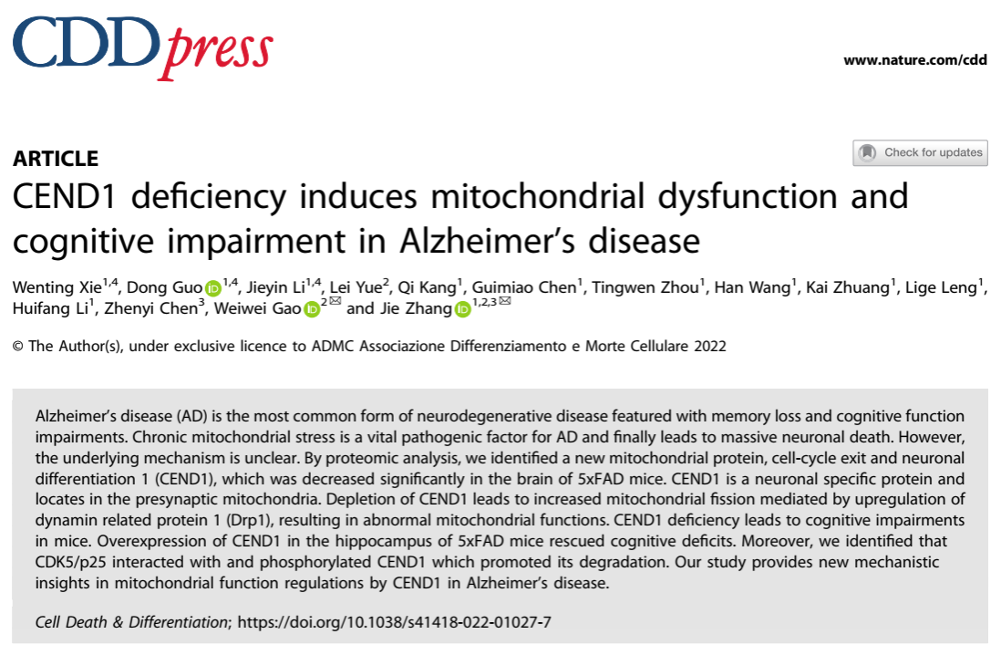 6月22日,OD网页版,OD(中国)神经科学研究所张杰教授团队在Nature旗下期刊Cell Death & Differentiation (IF:15.8)杂志上发表题为“CEND1 deficiency induces mitochondrial dysfunction and cognitive impairment in Alzheimer’s disease”的研究论文。该研究鉴定出了一个新的线粒体蛋白CEND1,并阐明了CEND1调控线粒体融合分裂导致AD发生发展的机制,为AD的防治提供了新靶点。