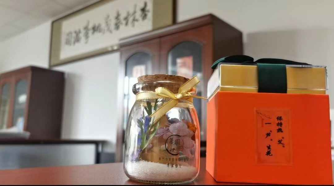 本届毕业礼物为中医系药园团队设计和制作的永生花礼盒。每个永生花瓶中搭配有一枚葫芦、数片艾叶,以及若干源自中医系药园的中药花卉。