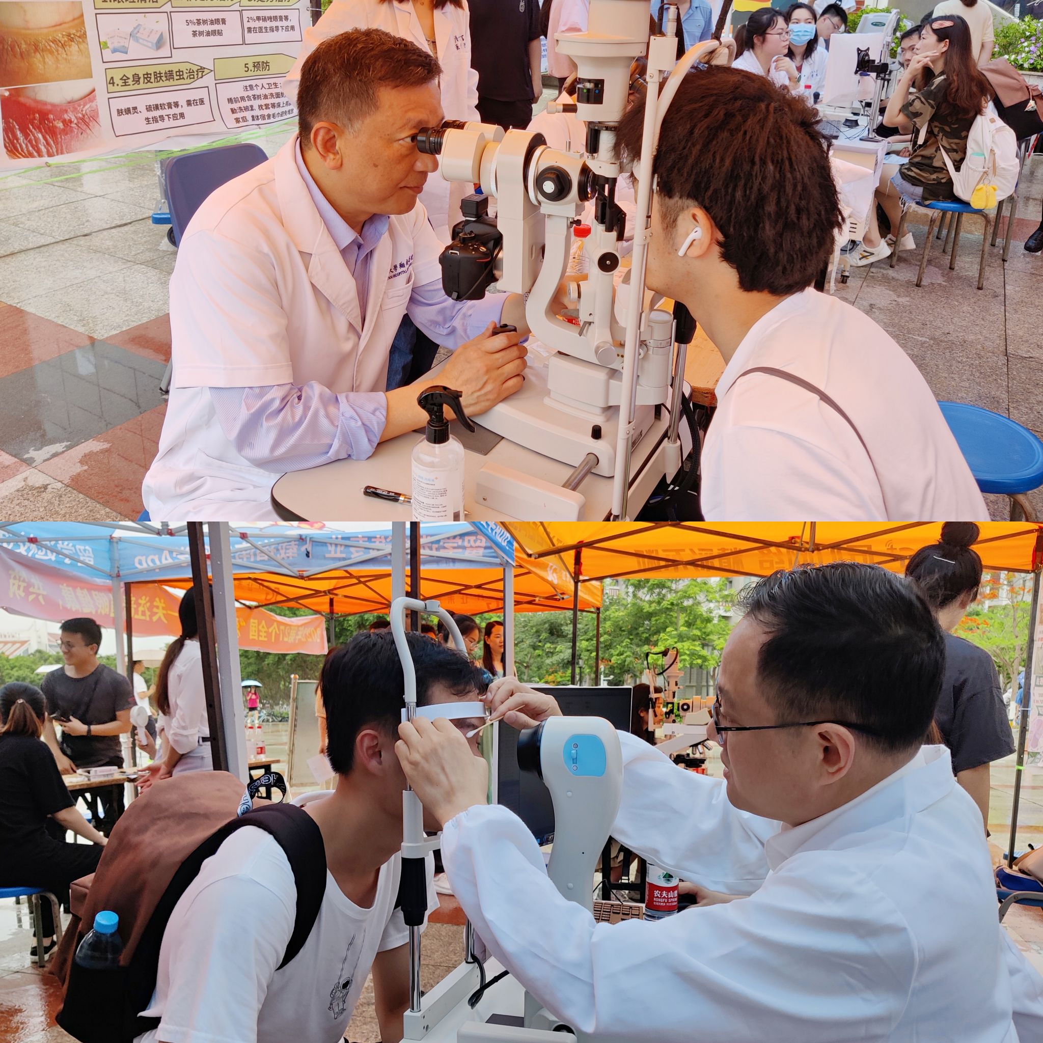 科普讲解后,眼科研究所刘祖国教授、李炜教授身着白大褂,开始了“专家义诊”。翔安医院眼科医生与眼科研究所党支部的医学生用专业的眼科仪器为现场参与活动的同学进行了屈光、眼底、睑板腺、眼睑螨虫等专业的眼科检查,并为大家进行悉心解答。