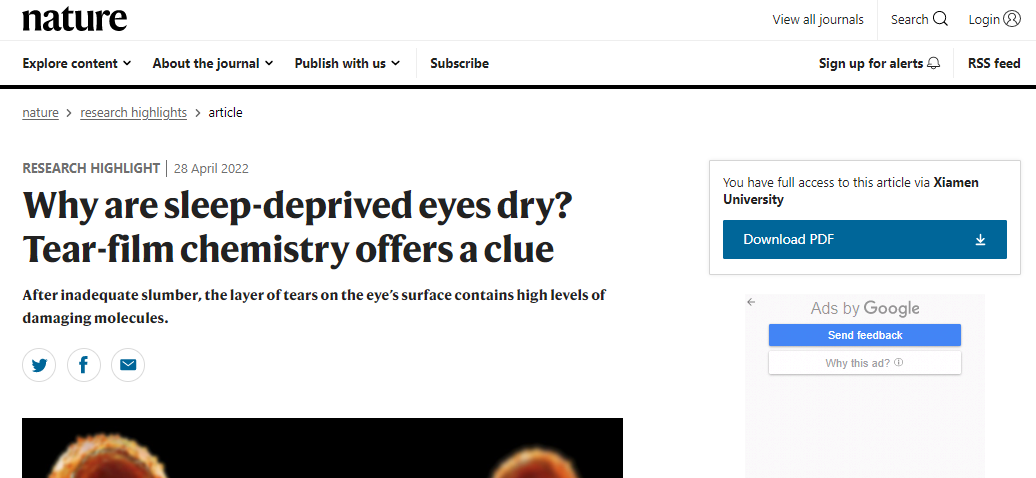 睡眠不足的人基本都有眼部不适的体验。刘祖国教授、李炜教授团队近5年来关注睡眠不足引起的眼部病变,发现睡眠不足导致眼表和泪液系统功能障碍,产生干眼,并阐明了其中的分子机制,同时在睡眠相关性眼表病变的治疗方面进行了有益探索。相关研究成果已发表在Experimental & Molecular Medicine,Investigative Ophthalmology & Visual Science等杂志,并获得多项国家发明专利。
