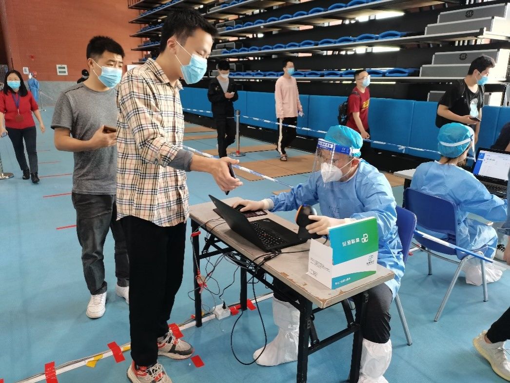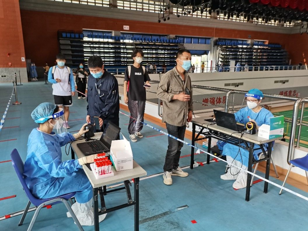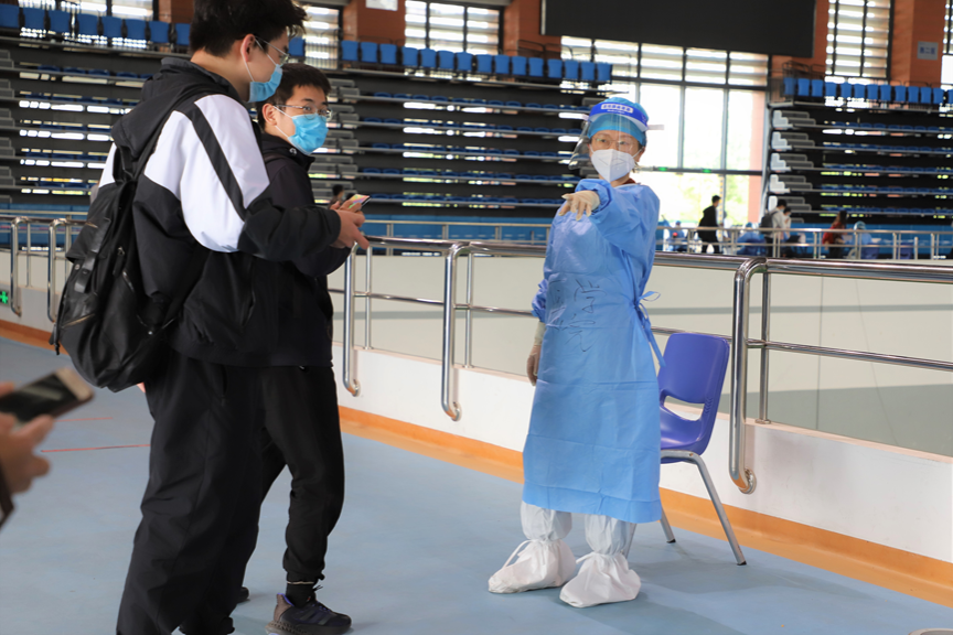 上午8:30,全体教工志愿者队伍在翔安校区体育馆参加了现场培训,按照防疫要求穿戴好全部装备后,迅速到岗到位,投入工作中。8名教工党员负责扫码检录,8名教工党员负责现场引导、维持秩序,2名教工党员负责核酸检测试管送检。