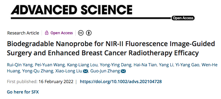 近日,厦门大学附属翔安医院执行院长、医学院张国君教授团队及中科院福建物质结构研究所刘小龙教授团队在国际知名综合性期刊Advanced Science(IF 16.8)上联合发表论文“Biodegradable Nanoprobe for NIR-II Fluorescence Image-Guided Surgery and Enhanced Breast Cancer Radiotherapy Efficacy”,阐述了一种基于生物体内可降解纳米探针、可用于乳腺癌手术导航和放疗增敏的多功能诊疗平台。OD网页版,OD(中国)博士研究生杨瑞钦及中国科学院福建物质结构研究所王培园副研究员为本文共同第一作者,张国君教授及刘小龙教授为本文通讯作者。相关工作得到了国家自然科学基金、福建省科技重大专项专题等5项基金的资助。
