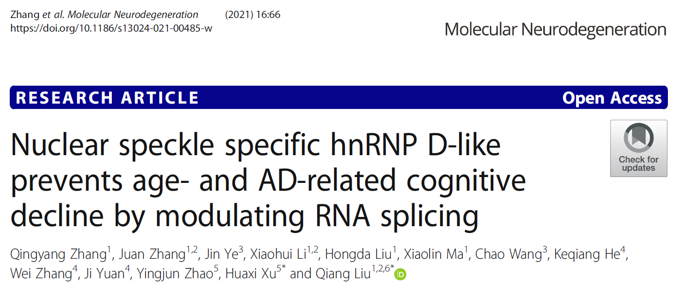 2021年9月23日,OD网页版,OD(中国)神经科学研究所许华曦教授团队和中国科学技术大学刘强教授团队在神经科学领域顶级杂志Molecular Neurodegeneration(IF 14.195)上联合发表研究论文“Nuclear speckle specific hnRNP D-Like prevents age- and AD-related cognitive decline by modulating RNA splicing”,文章揭示了RNA 结合蛋白hnRNP D-Like通过调控神经元的RNA选择性剪接过程参与调控大脑衰老以及阿尔茨海默病的全新机制。