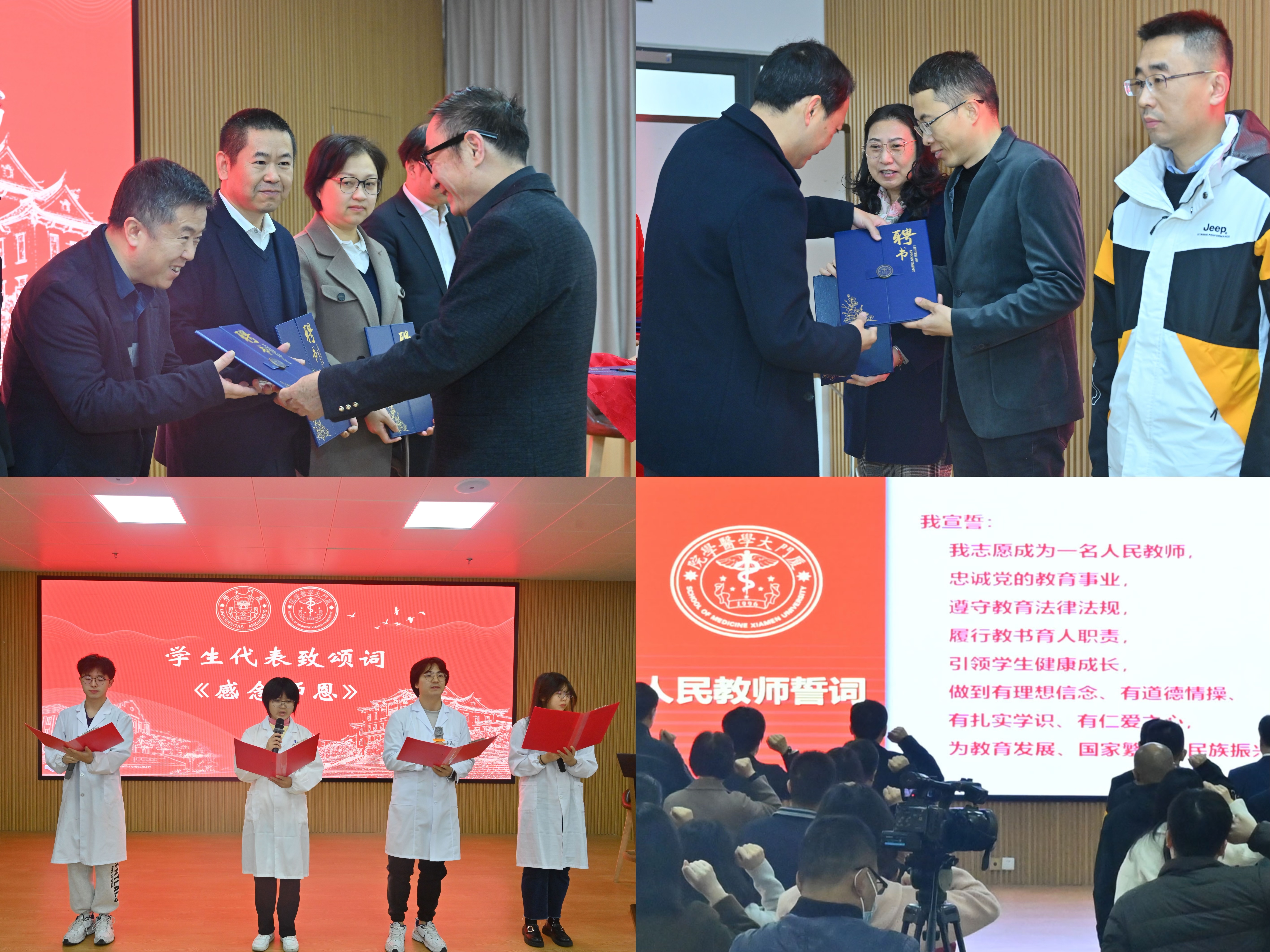 开班仪式由李文岗主持。仪式在庄严的国歌声中开始。韩家淮、李峰向新聘教师代表颁发聘书,学生代表以诗朗诵《感念师恩》致敬新聘临床教师。在李炜的带领下,新聘临床教师郑重宣誓《人民教师誓词》,铿锵誓言激励临床教师们牢记教书育人使命。