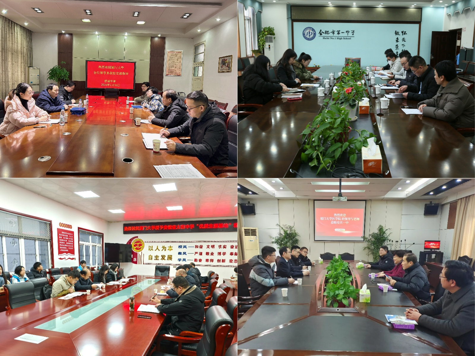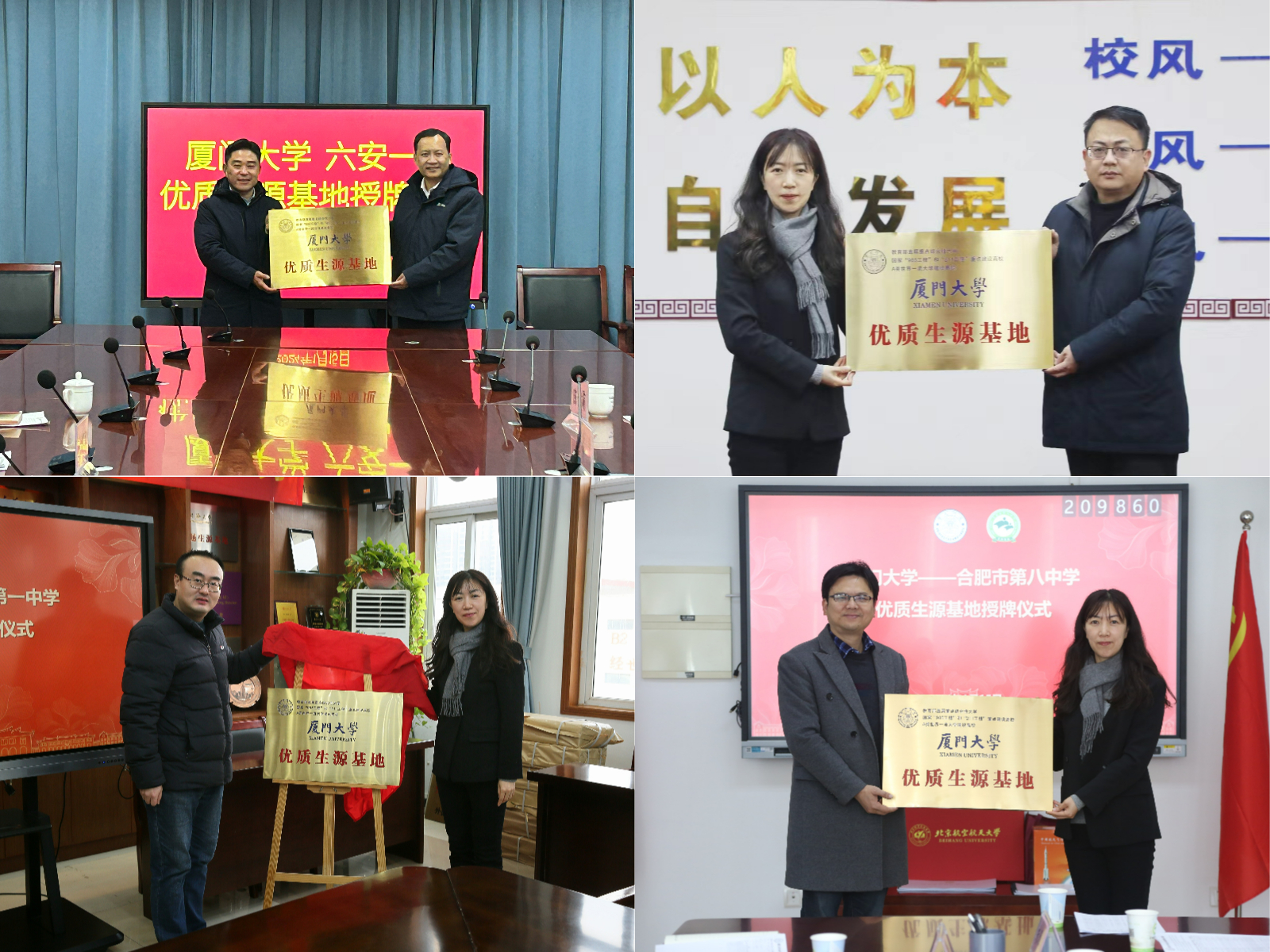 在合肥市第一中学、合肥市第八中学、六安第一中学、庐江中学、舒城中学、太和中学、太湖中学、安庆市第一中学等学校,分别举行了厦门大学“优质生源基地”授牌仪式和座谈会等。医学院党委书记李峰、党委副书记辛晓丹、副院长李炜等实践队师生与各中学负责人参加仪式并进行座谈。实践队分别向各中学介绍了厦门大学的办学历史、办学规模、校园环境、学科建设、未来发展等情况,并向各中学连续多年向厦门大学输送优质人才表示祝贺与感谢,希望未来厦门大学能够与各中学建立更加紧密的合作关系,培养出更多的优质人才。各个中学对实践队师生的到访均表示热烈欢迎,同时表达了希望双方能够通过多层次、多领域、多形式、多渠道的合作,搭建好优秀学生培养衔接的高质量平台,促进双方共同发展的美好愿景。