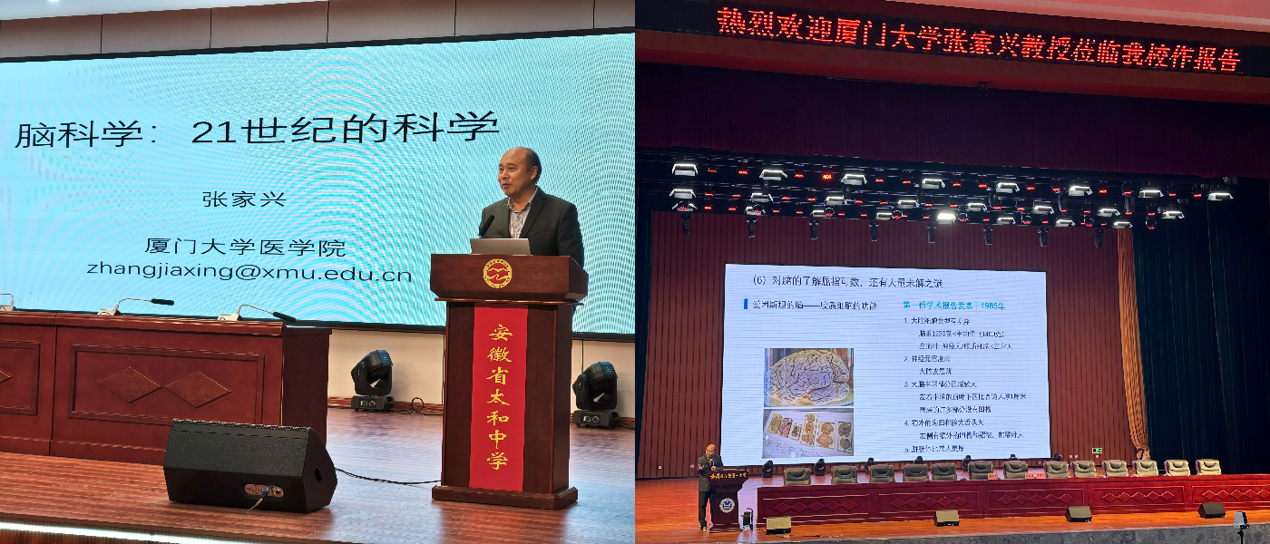 在六安第一中学和太和中学,医学院张家兴教授为中学学生们做了题为《脑科学:21世纪的科学》的科普讲座。张家兴教授从脑科学研究什么谈起,详细阐述了脑—机接口的工作原理和应用前景,他对大脑高级功能研究进展以及近二十年来新发展的技术的介绍,激发了中学生们对脑科学研究的好奇心,埋下了一颗日后投身于脑科学研究的种子。