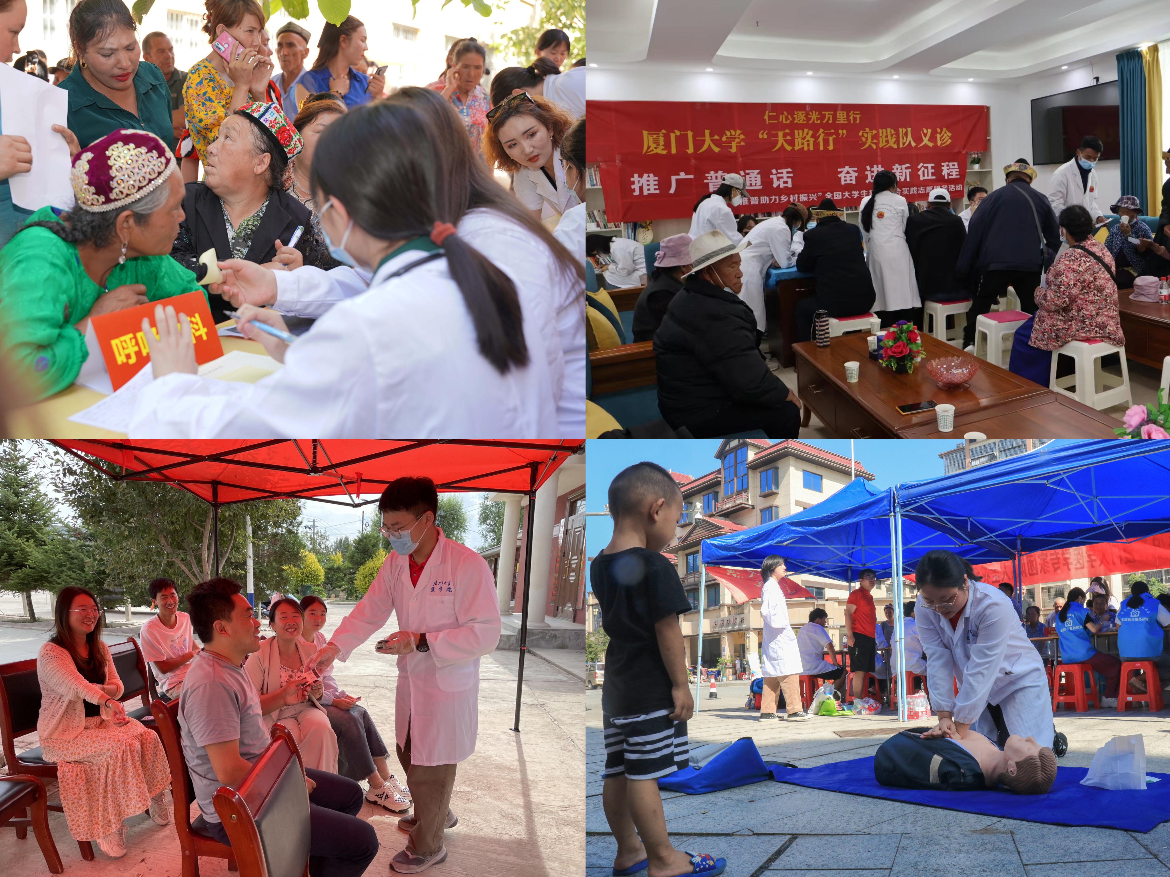 开拓“专业赋能”新路,让践行仁心为民走“新”更走“心”。习近平总书记强调:“当代中国青年要以聪明才智贡献国家,以开拓进取服务社会。”医学院用心打造“行走的思政课”,引导医学青年学生树立担当意识、服务意识、奉献意识,在社会实践中发挥专业优势,融入国家战略,以实际行动践行医者仁心。2023年,医学师生实践队赴西藏拉萨、林芝、新疆阿克陶、宁夏隆德、广西防城港、福建光泽等省内外16地,将所学专业与当地需求紧密结合,通过开展义诊送药、健康宣教、疾病调研、医疗帮扶等实践活动,投身乡村振兴、助力健康中国建设,累计服务群众2万余人次,引导学生实现由“知”到“行”的升华。深耕十年的“天路行”实践队扎根雪域高原,从路遇泥石流扛仪器进村的意外到停电秉烛整理数据的艰辛,累计服务当地10个乡镇73个行政村2万余名牧民群众,让100余名医学生擦亮学医初心,也吸引了一批批有志青年毕业后赴藏施展才干;三次入宁的“情系隆德”实践队、走进南平光泽的“医路向光”实践队投身对口帮扶工作,关注老年人健康,送医上门,走访调研100余户,在调研与服务中厚植家国情怀;二度赴疆的“仁心暖疆”实践队聚焦当地多发的肺结核病,在公安局、镇卫生院、社区集市等地开展义诊送药、科普宣传,派送药品20余类,服务群众400余人次。来自当地群众的“希望你们明年再来!”是对实践队员辛勤付出的最大肯定。