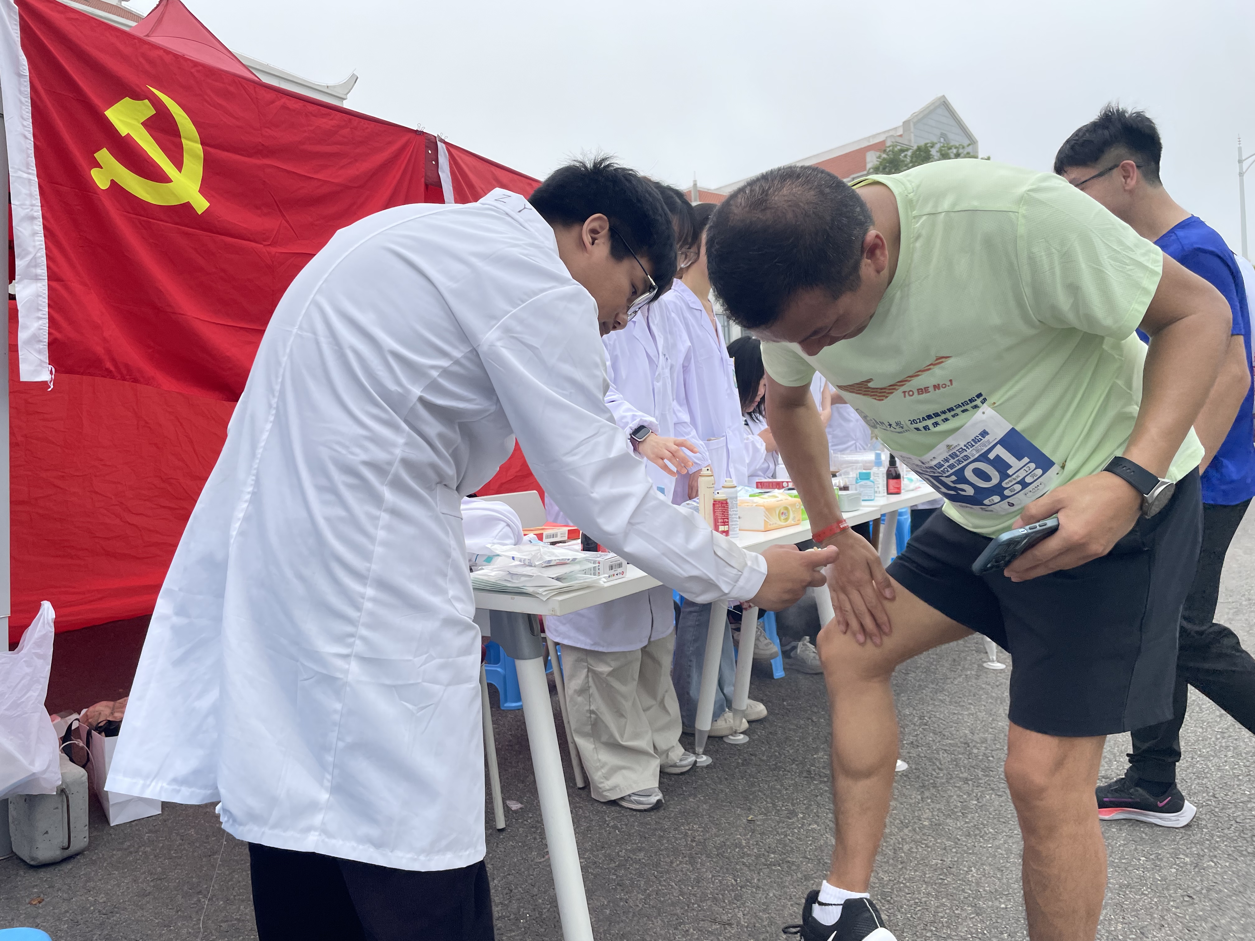 众所周知,医疗保障是赛事安全工作的重要环节。本届赛事组织机构设置了医疗保障组,由校医管办主任、我院党委书记李峰担任组长。医学院积极参与赛事医疗保障工作,学院迅速组建“仁心先锋”党员志愿服务队,由党委副书记辛晓丹指导、团委书记邱超超具体负责,队员为郑泽原、陈俊宏、高艺洋、吴曼、赵武梅、王鑫、孙阿玲、孔楚楚、杨璐、梁如冰、邓秋敏等11名具备执业医师资格的研究生党员,在学院成义楼前设置医疗服务点,作为赛事医疗保障的补充机动力量。
