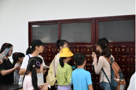 第一场活动为参观八闽园药园和临床技能中心中医实训室。在研究生支部领队们的带领下,孩子们首先前往八闽园药园参观药用植物及中医药文化长廊。中医系药园团队的讲解员实地介绍了药园中各种药用植物的形态特征、产地背景、药用价值、植物文化以及中医药历史中的典籍和人物、福九味等内容,并与孩子们互动问答。结束药园参观,孩子们随后前往临床技能中心参观中医实训室及中医学专业学生作品展。在实训室,孩子们动手触摸脉诊仪,亲身感受不同脉象的变化特点;打开一个个中药柜,孩子们认真观察辨认不同中药饮片的颜色、质地、气味和形状,对中药原植物及其饮片的区别有了更深的认识;在针灸人体模型前,孩子们对经络腧穴和针灸疗法有了更直观的理解。