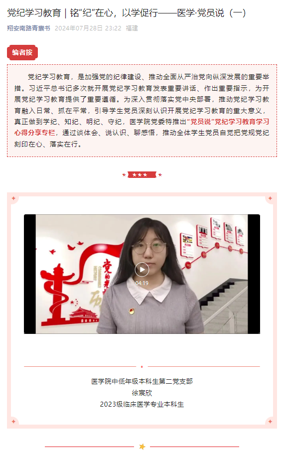 开展党纪学习教育以来,医学院党委坚持以习近平新时代中国特色社会主义思想为指导,深入贯彻落实习近平总书记关于党纪学习教育的重要讲话和重要指示精神,围绕学习贯彻《中国共产党纪律处分条例》,立足学院实际,突出主题主线;分层分类指导,突出精准施策;围绕中心工作,突出增强实效,组织学院师生党员不断加深对党规党纪的理解把握,以学纪知纪促进明纪守纪,从党纪学习教育中汲取奋进力量,推动学院党建工作与事业发展深度融合,以高质量党建引领推动学院事业内涵式高质量发展。