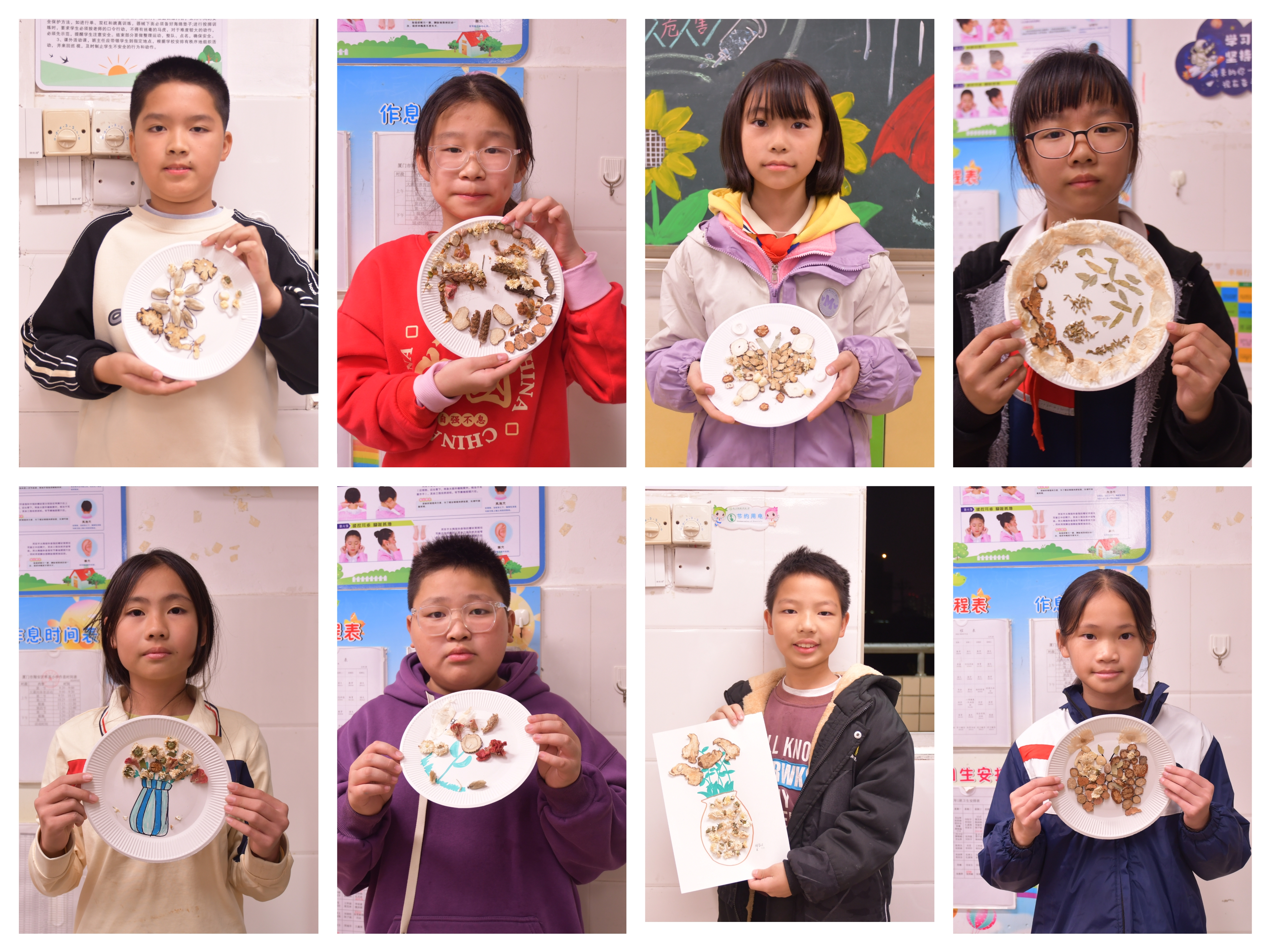 五年级中医药趣味小课堂的主题为中药饮片贴画。小老师为同学们介绍了金银花、枳壳、莲子、当归等几种常见中药如何从原植物经过采挖、加工、炮制变成中药饮片的基本过程,并指导他们制作饮片贴画,通过画、拼、剪、贴等方式将中药饮片组合成生动的美术作品。在这一过程中,同学们不仅近距离观察、体验了数十种常见的中药饮片,一幅幅精美、富有童趣的饮片贴画也充分体现了孩子们丰富的想象力和创造力。