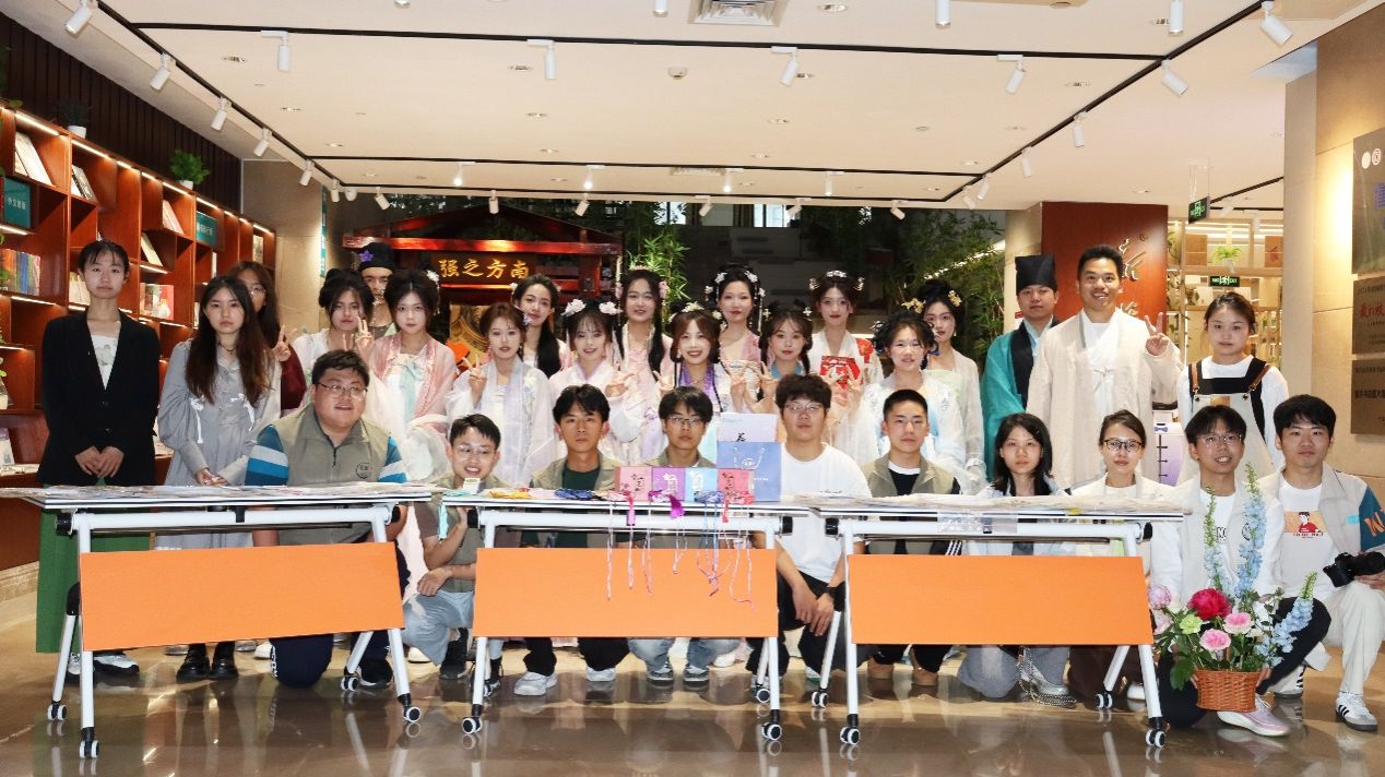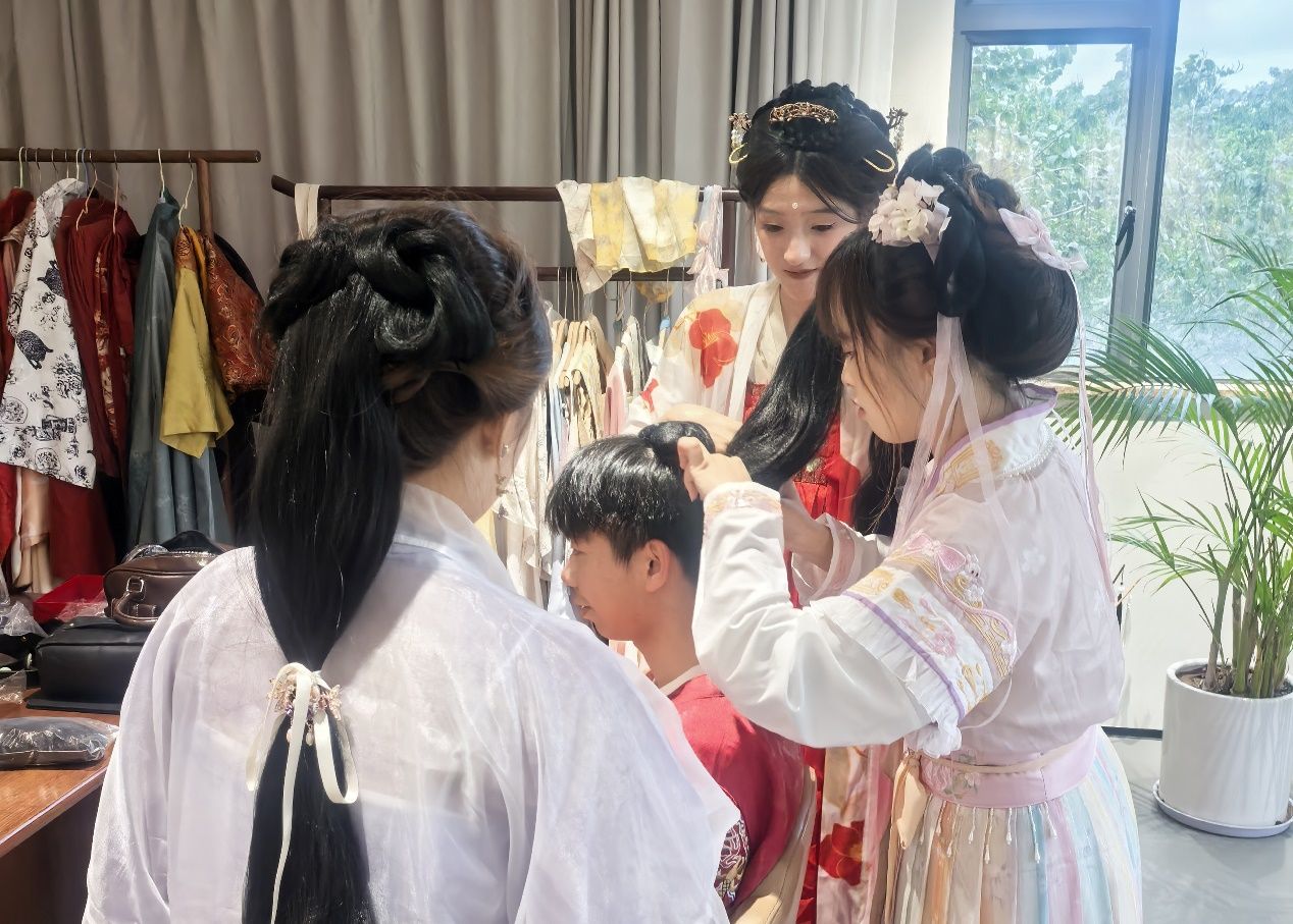汉服体验活动在新华书店内的汉服文化体验区进行。药园教学助理林静和张晓玥为体验者提供汉服妆造,琼华汉服社的工作人员还为体验者讲解古代服饰知识、妆容发型特点及其文化内涵。
