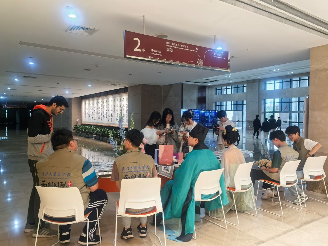 本次活动主题为“花宣香明,心领神卉——多方洞见中医药本草之美”,现场分为香囊配制、识花辨卉、品茗调息、文创盖章及汉服体验等五大环节,以中医药经典为基础,通过赏药卉、制香囊、品佳茗、穿汉服等寓教于乐的形式,带领师生共同领略中医药文化的魅力。