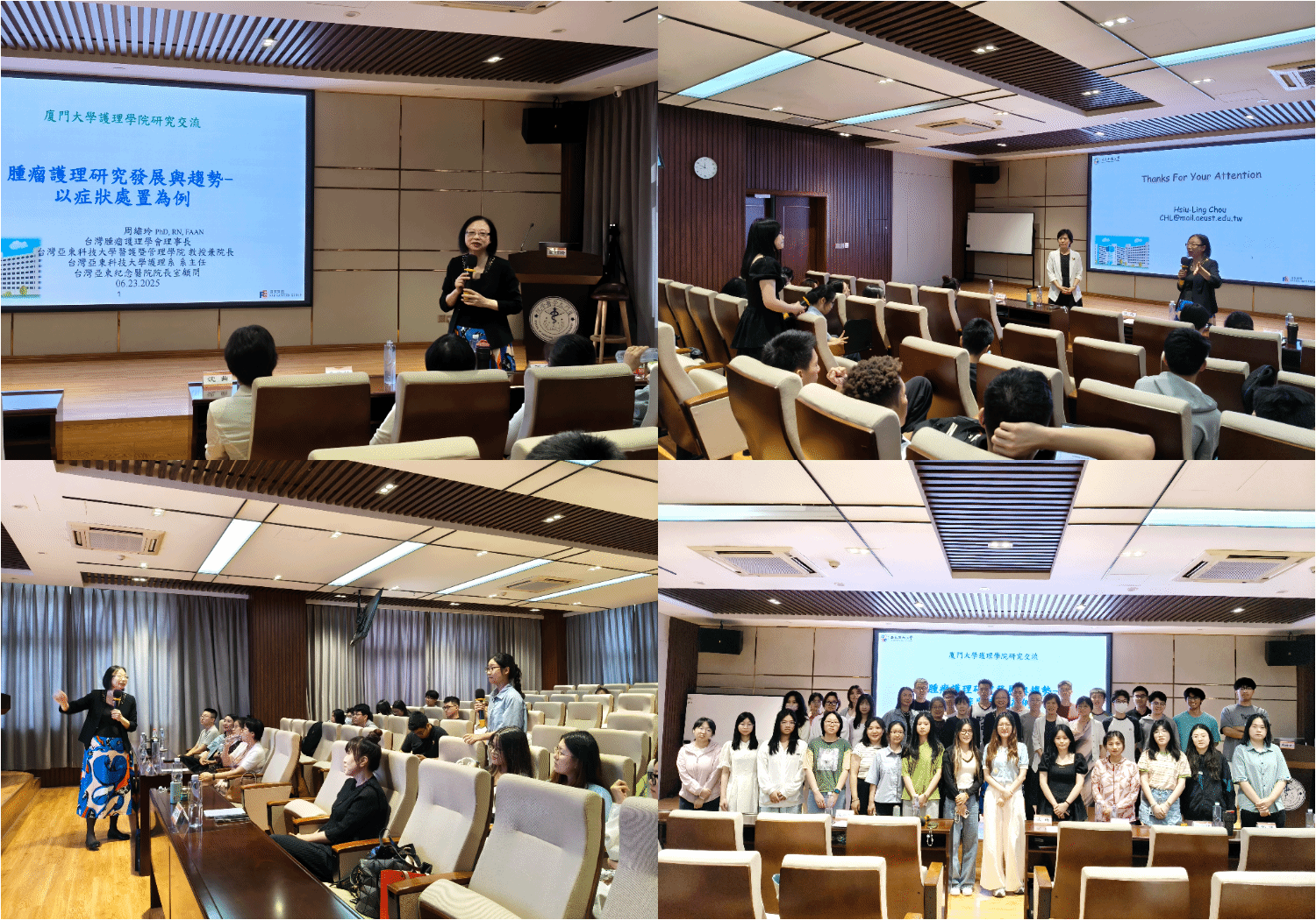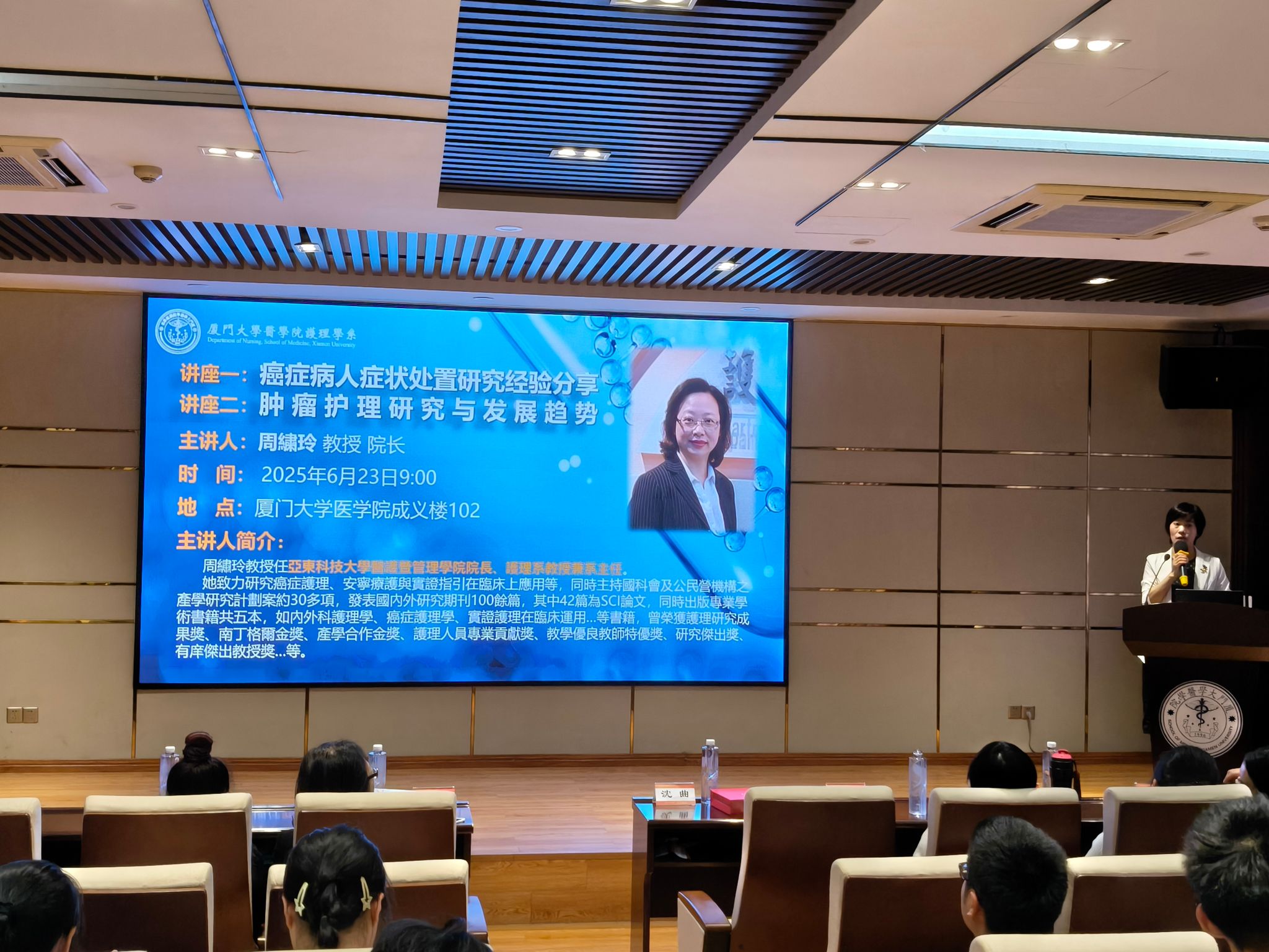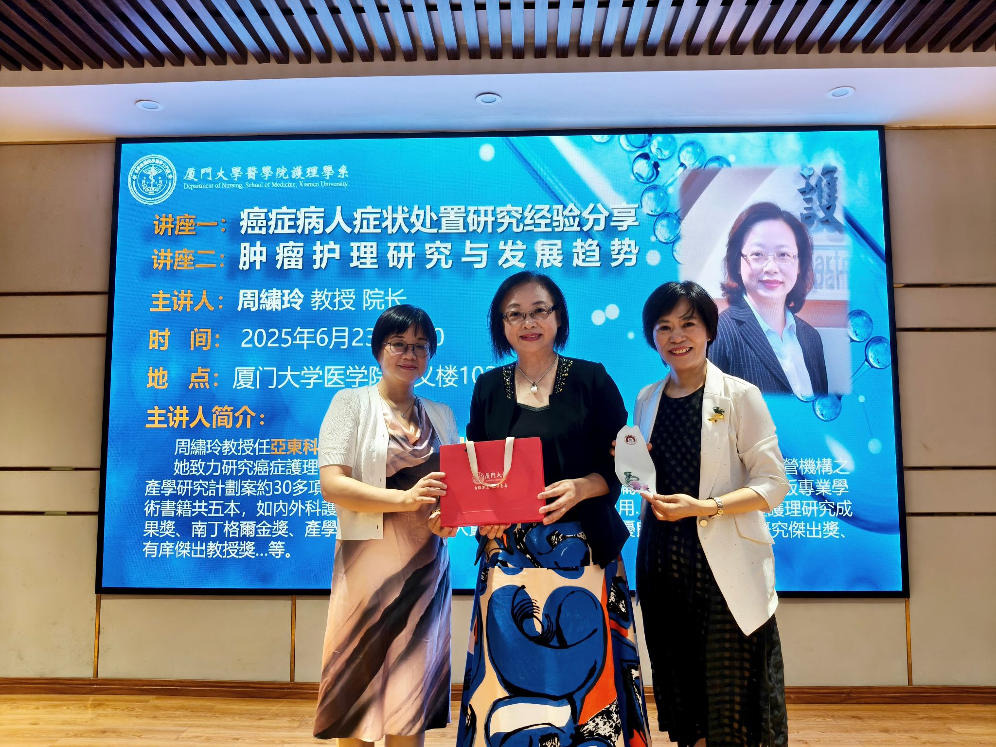 6 月 23 日上午,台湾亚东科技大学护理管理学院院长、亚东纪念医院院长室顾问、台湾肿瘤护理学会理事长周繍玲教授受邀在医学院成义楼102开展题为“癌症病人症状处置研究经验分享”、“肿瘤护理研究与发展趋势”的学术讲座,台湾全联会理事长陈麗琴女士随同出席。护理系副主任沈曲副教授主持活动,护理系全体师生聆听讲座并参与交流。